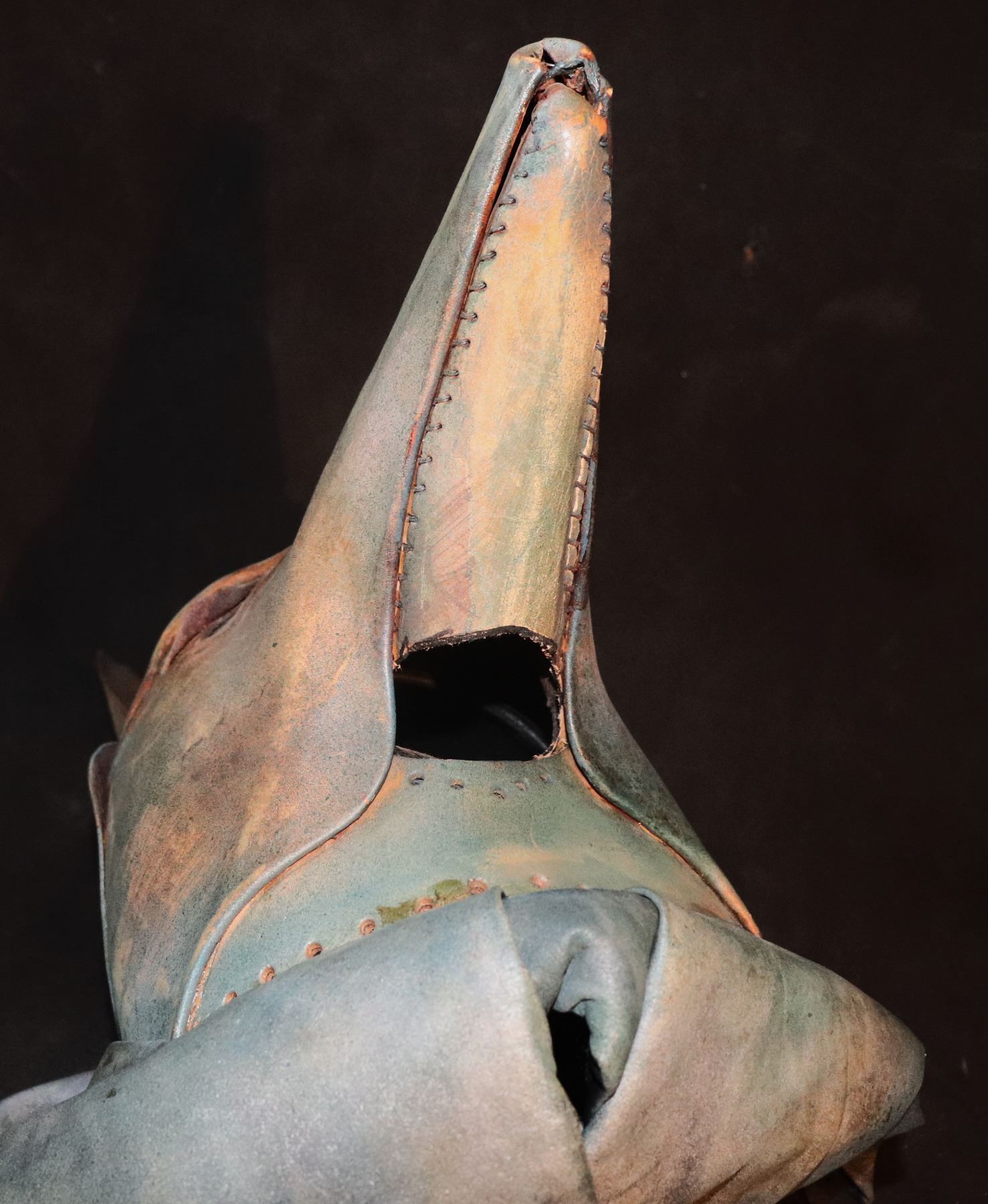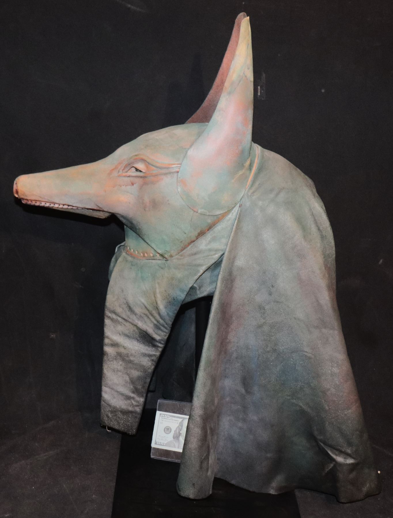 All hand tooled leather ANUBIS full head mask worn by the priest who wraps up IMHOTEP in the Sarcophagus in the opening ancient Egypt scenes. Spectacular Display!
