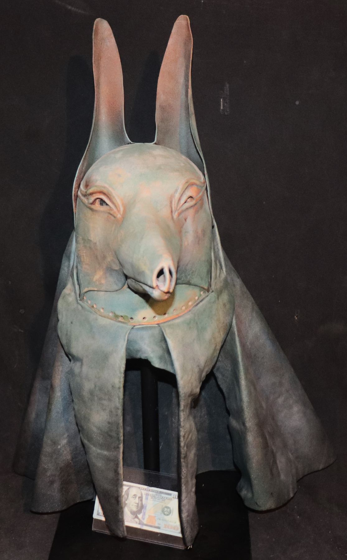 All hand tooled leather ANUBIS full head mask worn by the priest who wraps up IMHOTEP in the Sarcophagus in the opening ancient Egypt scenes. Spectacular Display!