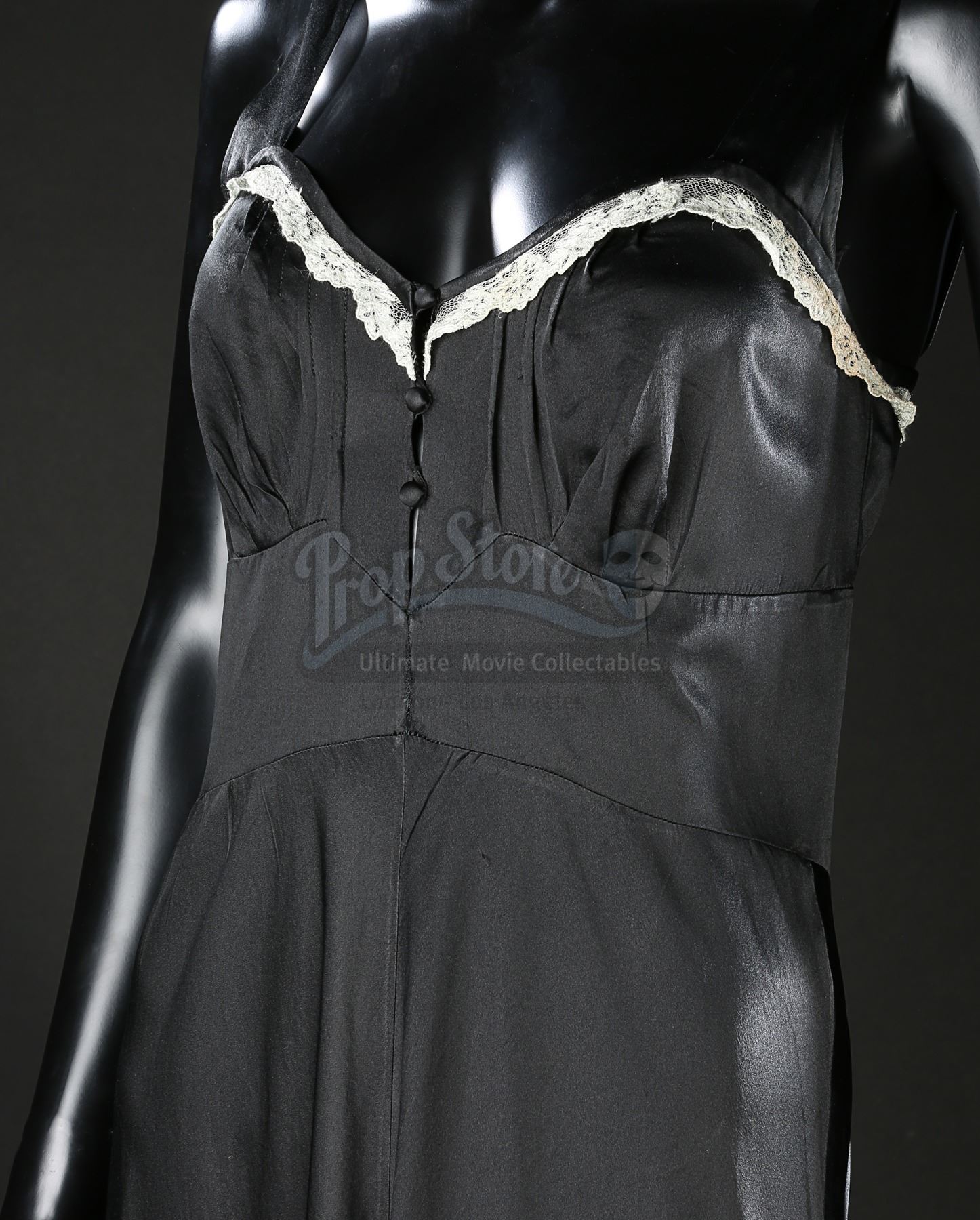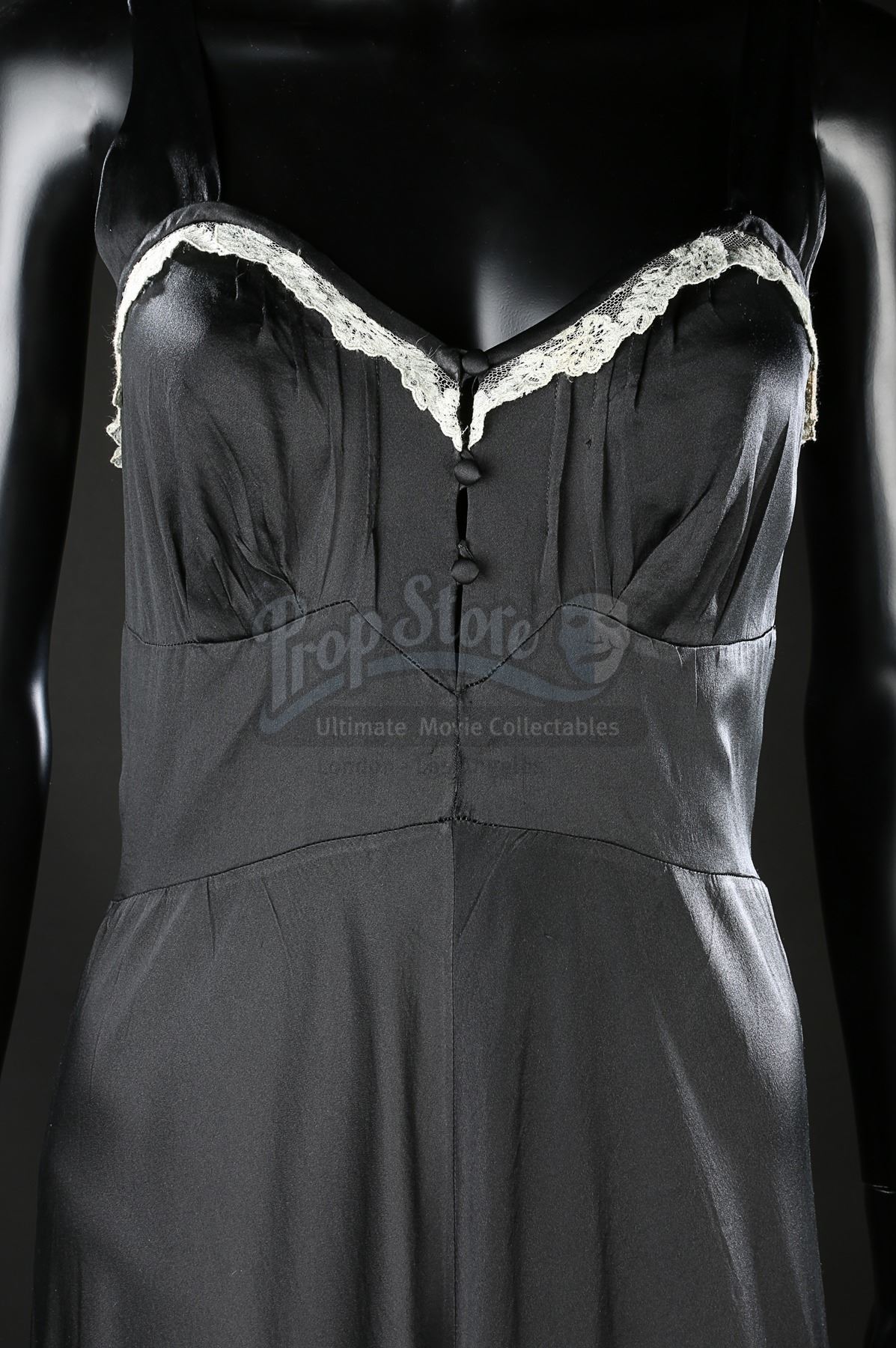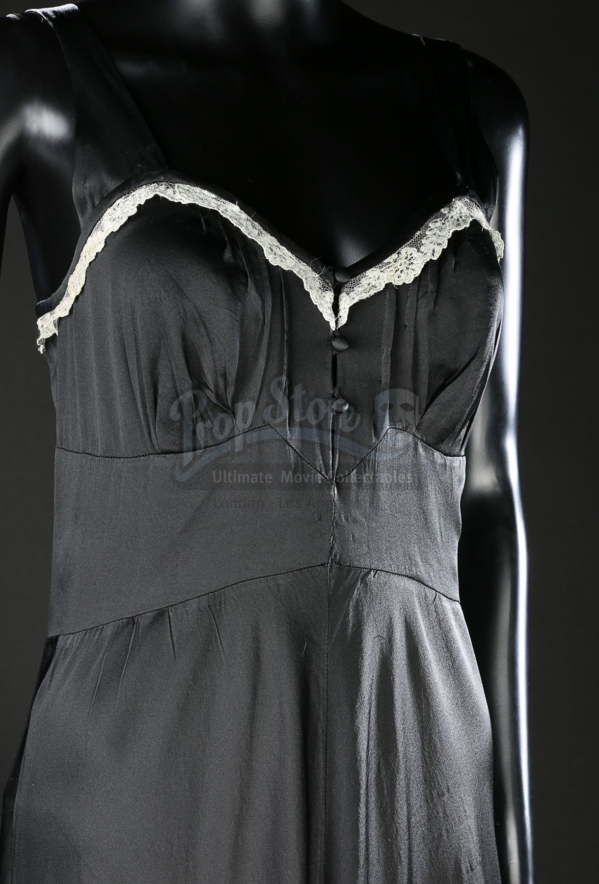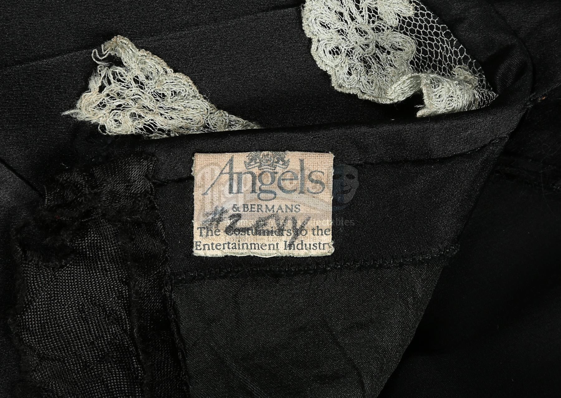 Resembling a night gown, the full-length dress is made of black silk, with a white lace sweetheart neckline. It displays two shoulder straps and fastens at the front with three matching silk-covered buttons, and down the back with small metal hooks and thread loops. An Angels costumiers label is adhered to the inside, with '#2 Evy' handwritten in black ink. The dress has frayed threads and many of the loops used to secure it at the rear have come away due to production use and age.