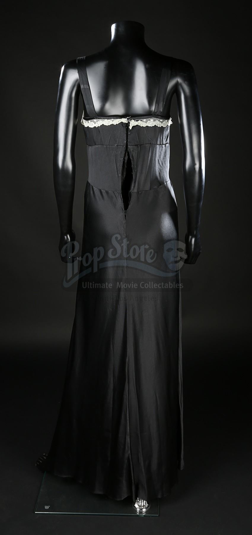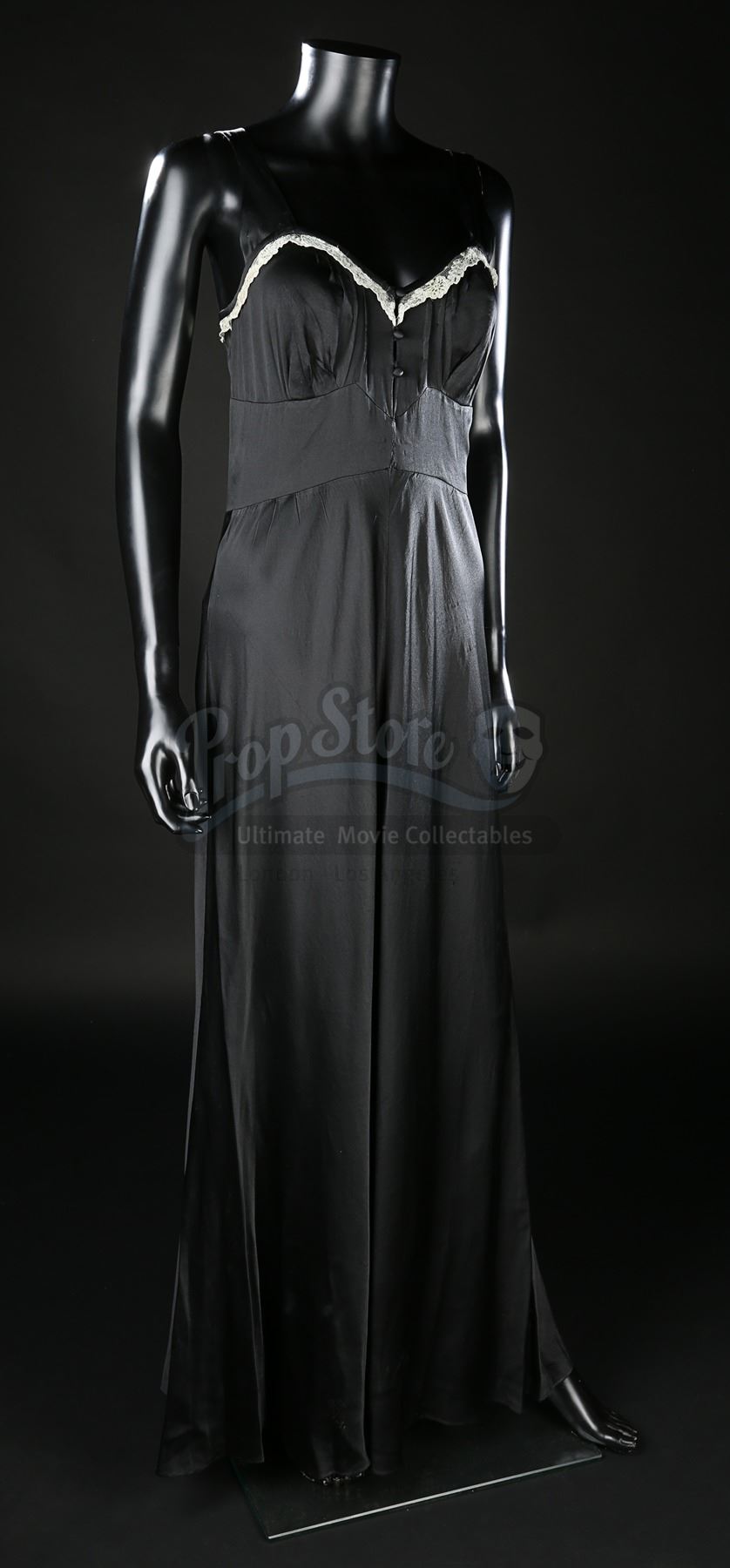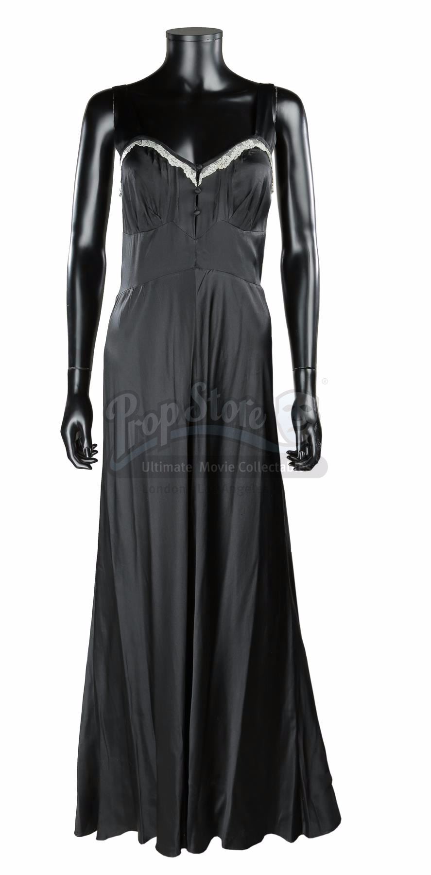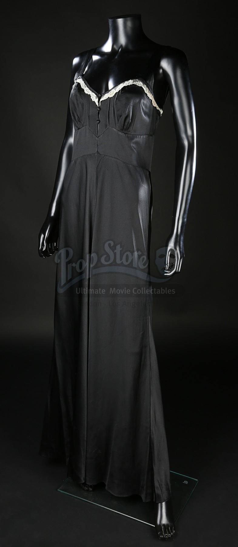 Resembling a night gown, the full-length dress is made of black silk, with a white lace sweetheart neckline. It displays two shoulder straps and fastens at the front with three matching silk-covered buttons, and down the back with small metal hooks and thread loops. An Angels costumiers label is adhered to the inside, with '#2 Evy' handwritten in black ink. The dress has frayed threads and many of the loops used to secure it at the rear have come away due to production use and age.
