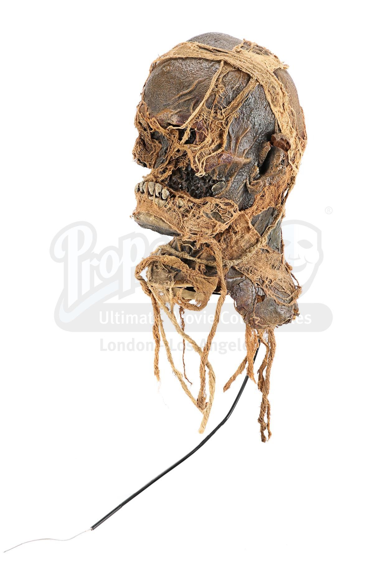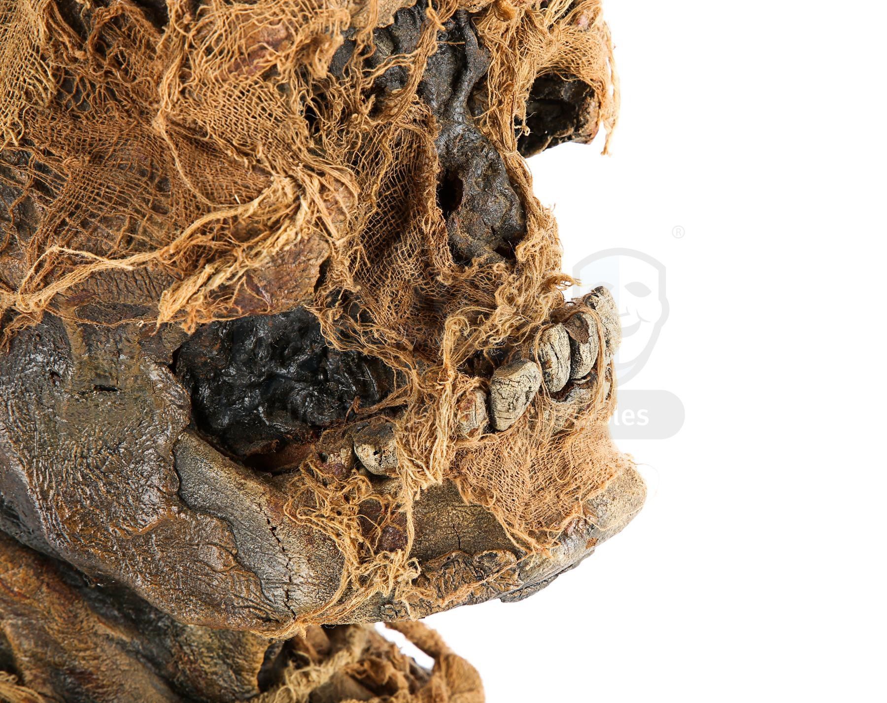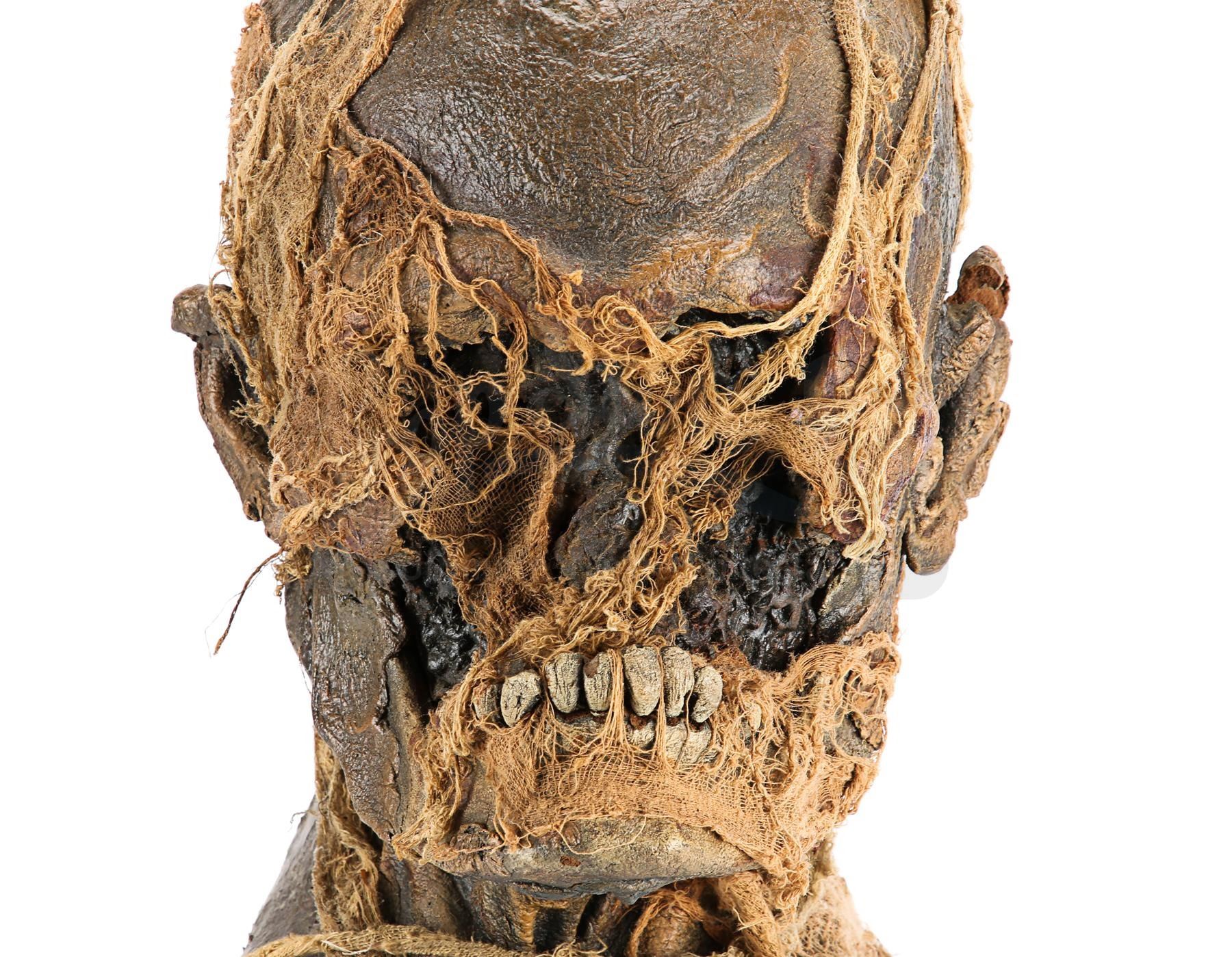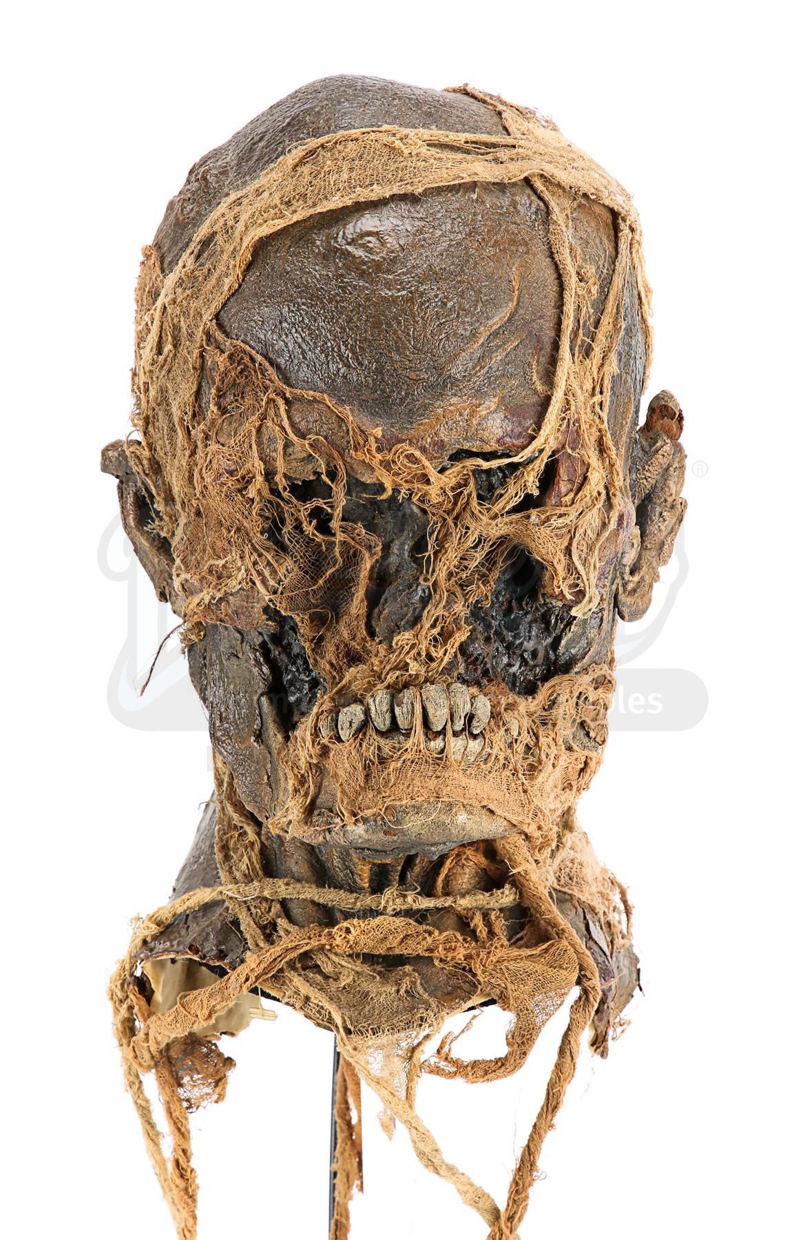 A special effects mummy mask from Stephen Sommers' action adventure The Mummy. Mummies were raised from the dead by Imhotep (Arnold Vosloo) to defend himself and keep Rick (Brendan Fraser) away from Evelyn (Rachel Weisz) while he tried to use her to resurrect Anck Su Namun (Patricia Velásquez).