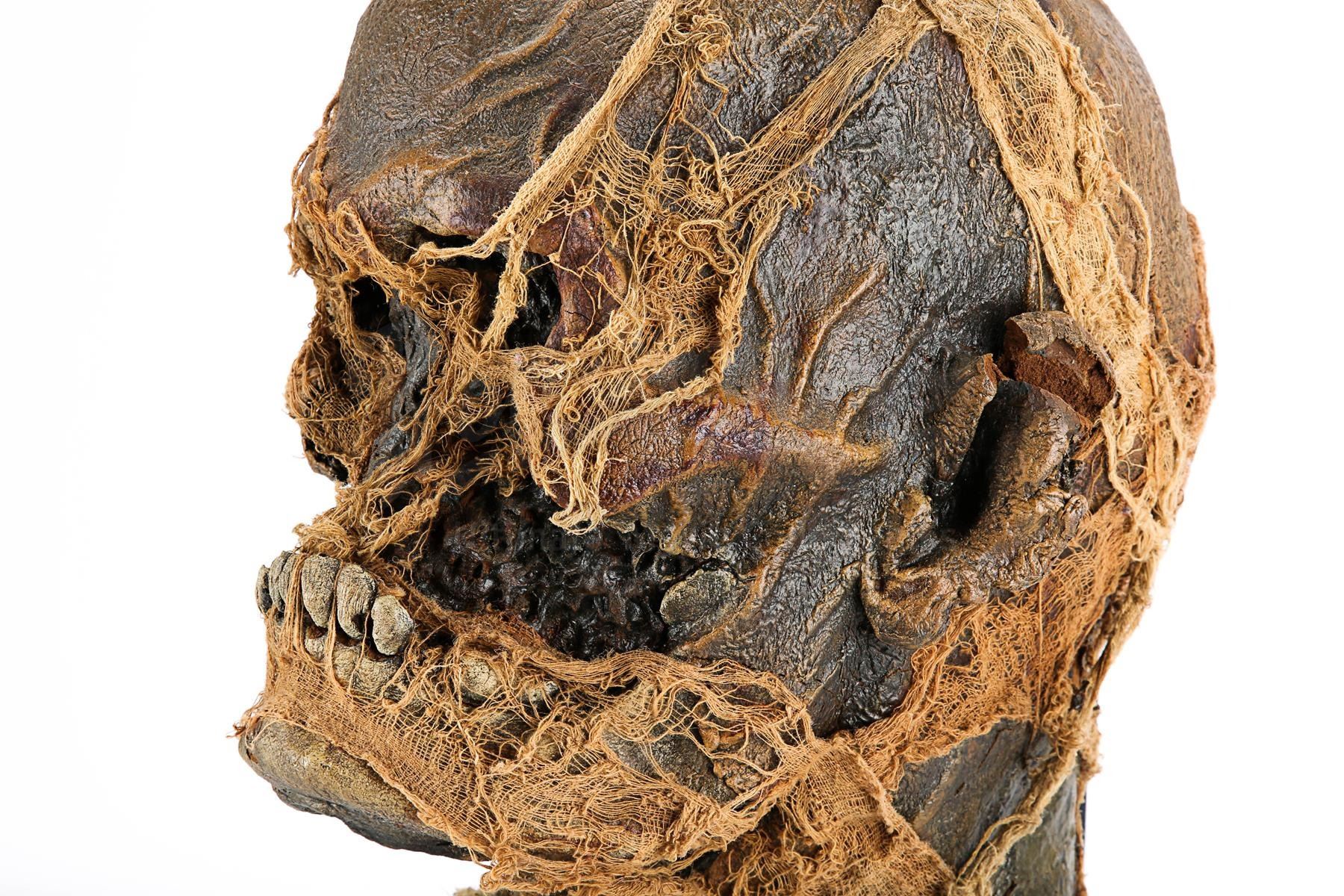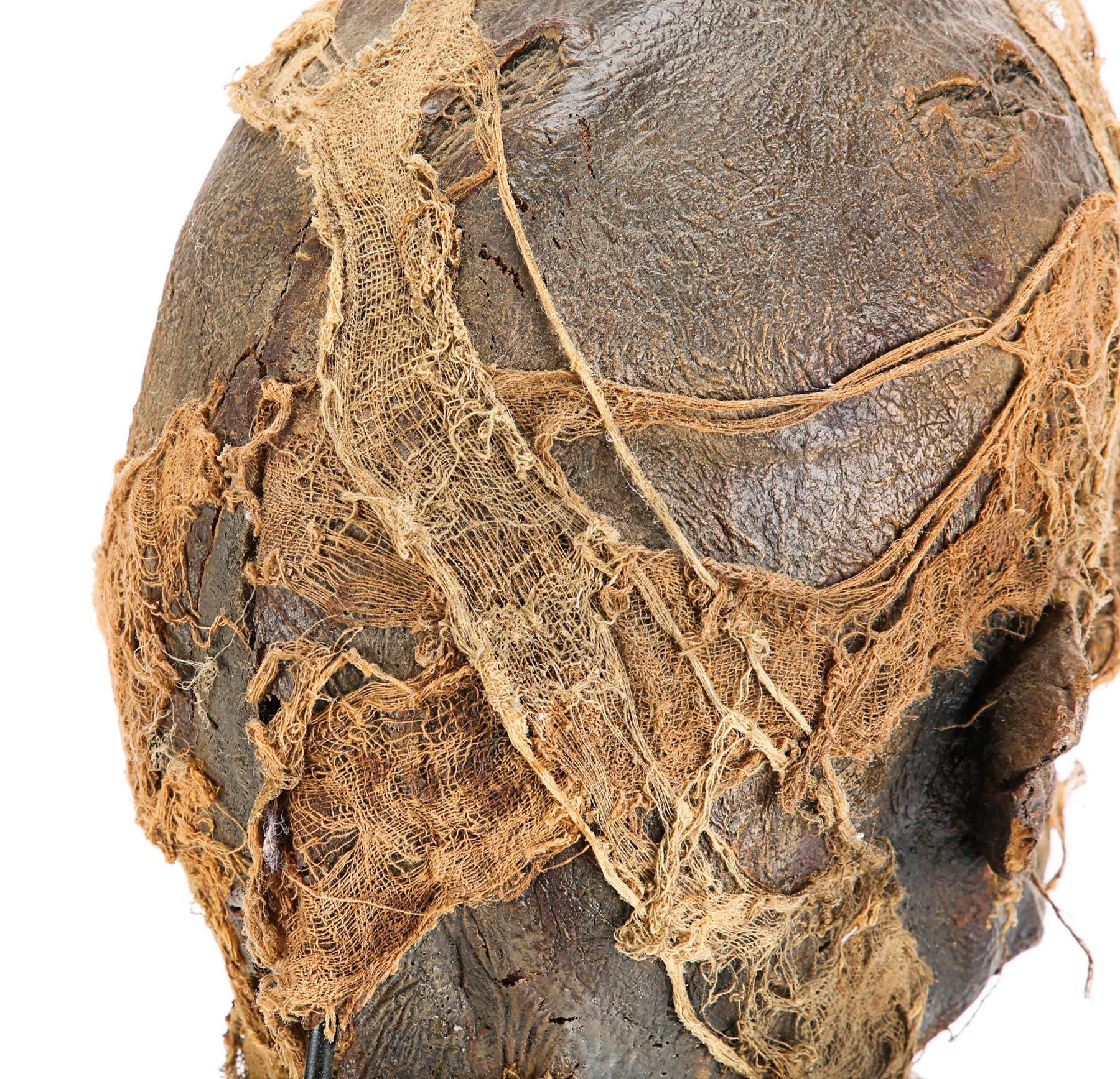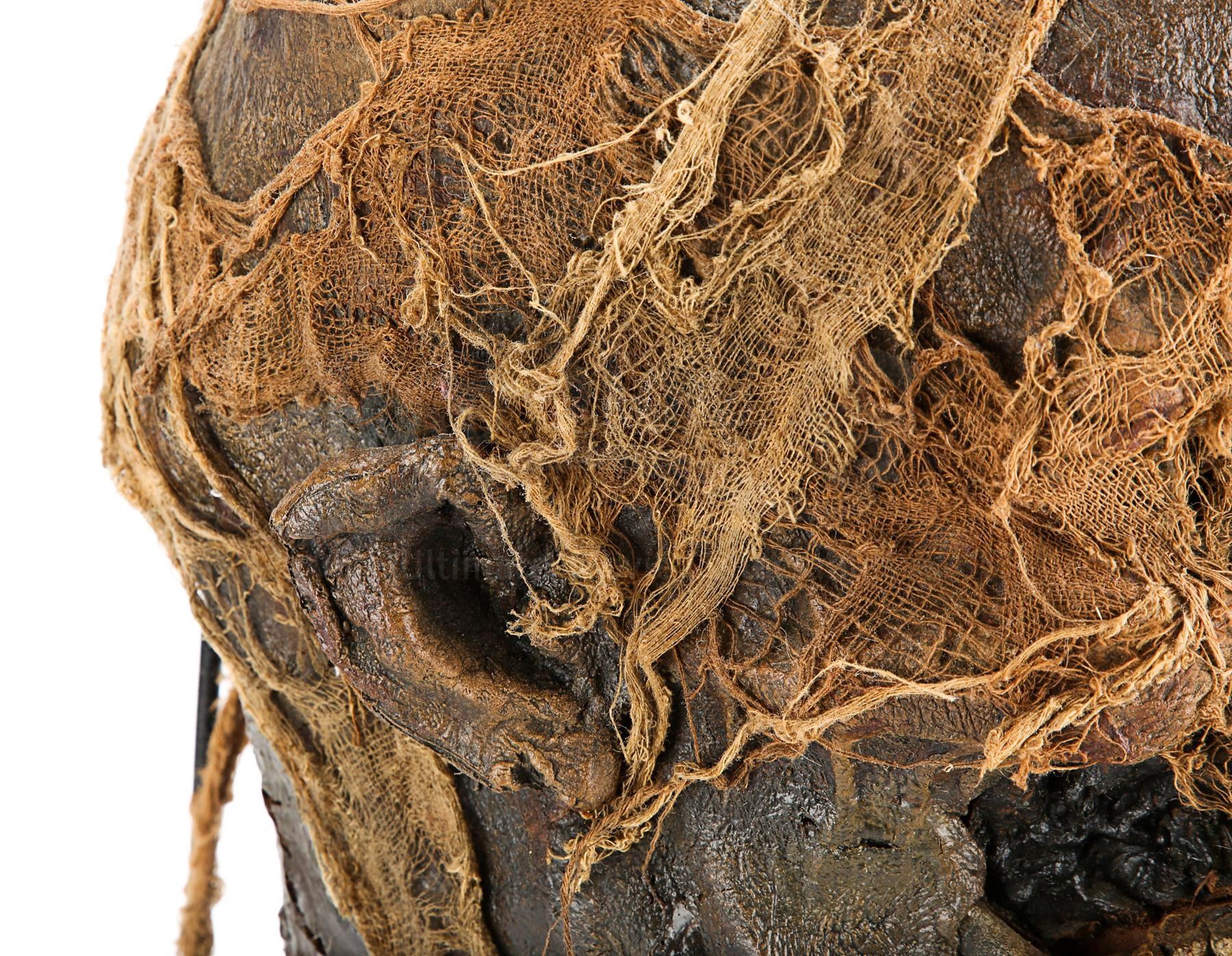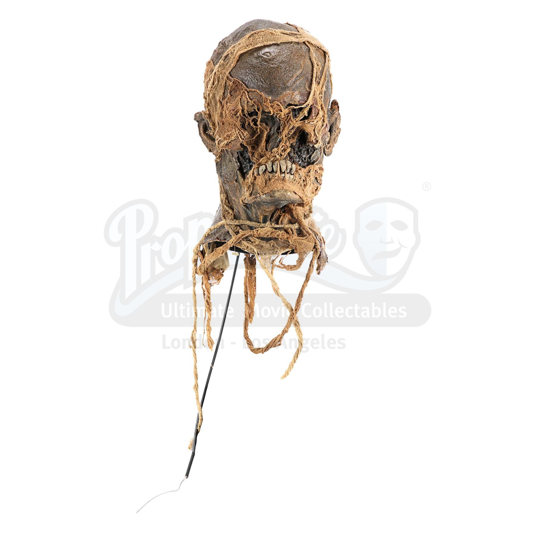 A special effects mummy mask from Stephen Sommers' action adventure The Mummy. Mummies were raised from the dead by Imhotep (Arnold Vosloo) to defend himself and keep Rick (Brendan Fraser) away from Evelyn (Rachel Weisz) while he tried to use her to resurrect Anck Su Namun (Patricia Velásquez).