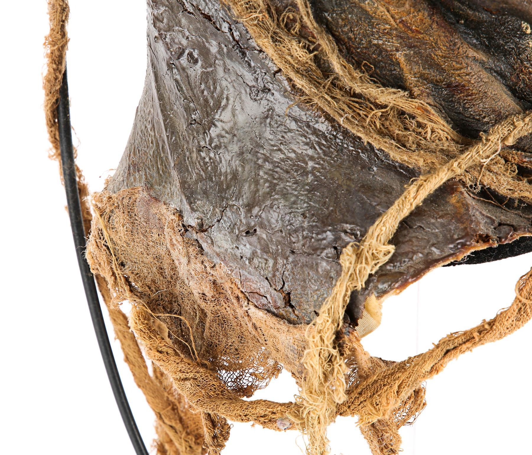 This head is made of foam latex and rubber, and hand-painted to look ancient and decayed. It is covered in brown fabric wrapping to simulate the burial bandages. It would have been placed over the actor's head and tightened with the Velcro inside the mask. A metal wire, covered in rubber, protrudes from the neck. The wire is used to control the jaw movement, although due to age the movement is minimal. "C.J. 2" is handwritten in black marker inside the neck. The head comes on a custom-made display stand and has some wear from age and use, including flaking and cracking around the edges of the piece. Dimensions: 28 cm x 19 cm x 60 cm (11" x 7 1/2" x 23 1/2")
