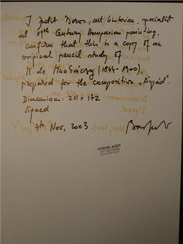 The work was physically examined by Mrs. Boros Judit, who is an Art historian specializing in 19th century Hungarian Art and in particular the works of Munkacsy .