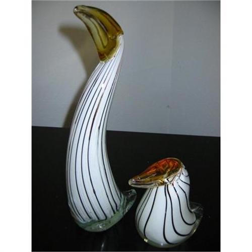 DECORATIVE PAIR OF TALL AND SHORT MURANO BIRDS. THEY ARE VERY NICE. THE COLORS ARE WHITE WITH BLACK STRIPES AND THIER BICKS ARE GOLDEN YELLOW. HAND BLOWN AND WELL MADE. MUST HAVES.