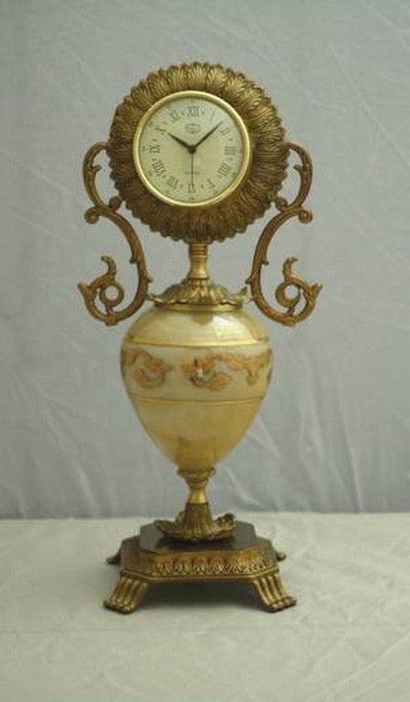 MURANO CRYSTAL CLOCK - HAND PAINTED GOLD DESIGN - INTRICATE BRASS BASE - ROMAN NUMERALS - 5L" x 5W" x 16H"
