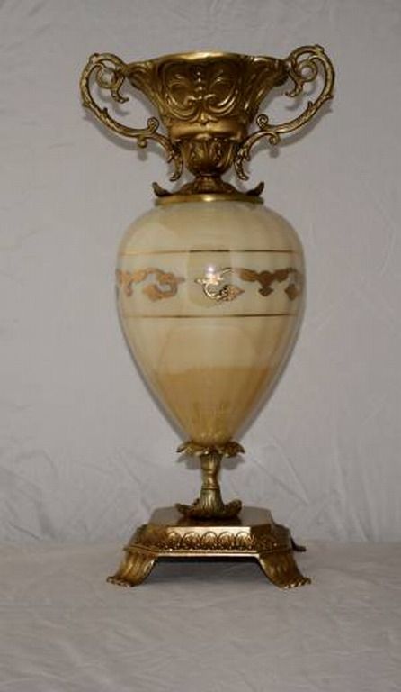 MURANO CRYSTAL VASE - HAND PAINTED GOLD ARTWORK - BRASS BASE AND ACCENTS - 9L" X 8W" X 18H"