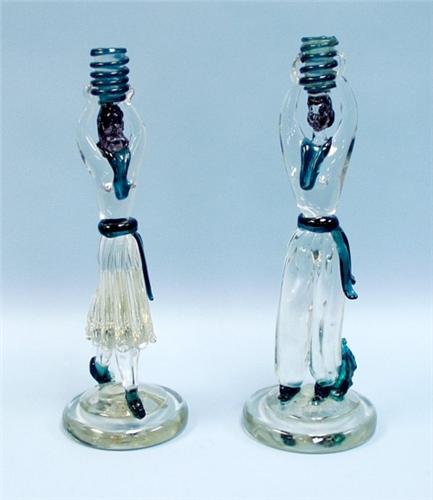 MURANO - FULVIO BIANCONI. A pair of Italian figural glass candle holders. With green and purple glass highlights. 18" high. Circa 1948.
