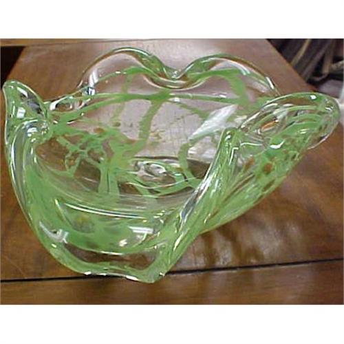 MURANO GREEN BOWL W/ GOLD SPECS HAS LABEL 2 3/4 HIGH 7 IN WIDE
