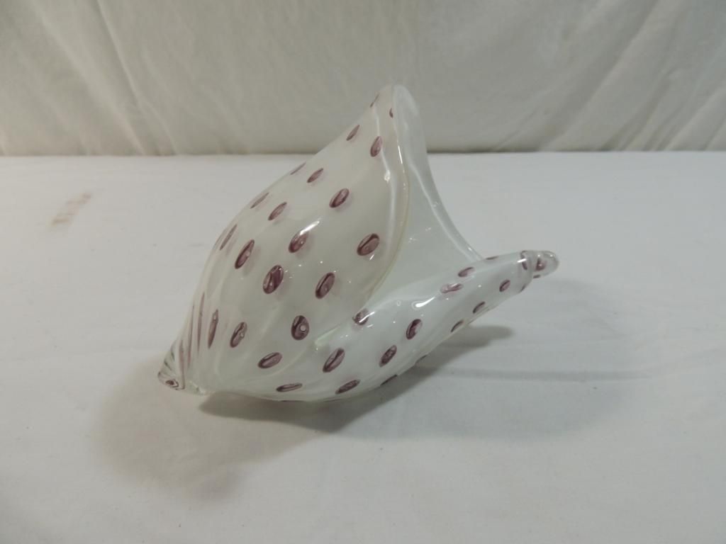 SEASHELL SCULPTURE WHITE PURPLE DOTS A ONE OF A KIND DESIGN FROM THE ISLAND OF MURANO, ITALY. EACH OF THEIR HAND BLOWN PRODUCTS ARE THE HIGHEST QUALITY ORIGINAL MURANO GLASS MADE ACCORDING TO ANCIENT TECHNIQUES AND TRADITIONS. BEAUTIFUL UNIQUE PIECE RETA