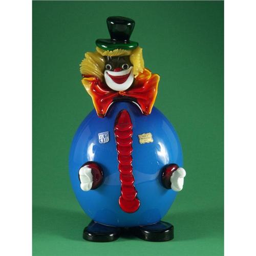 MURANO GLASS CLOWN: A large mouth-blown multicolored clown, 17'' x 8.75'', blue egg shaped body, large bow, top hat with original label ''K and B Creations. Made in Murano, Italy '', 1960's.