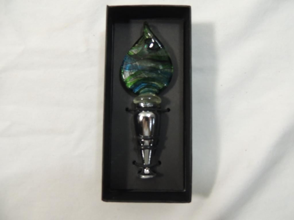 GLASS AND METAL DECORATIVE BOTTLE STOPPER,WINE BOTTLE STOPPER, DESIGNER STOPPER, BOTTLE TOPPER AS SHOWN SEE PHOTO FOR MORE DETAILS.