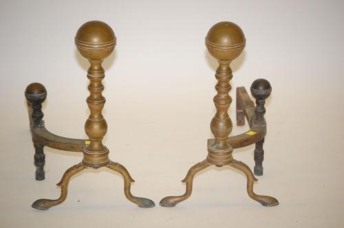 MURDOCK BRASS CANNONBALL ANDIRONS - PR. 19TH CENT. BRASS BOSTON STYLE WELL TURNED BRASS ANDIRONS W/ PAGODA BASES & SHORT BALL STOP BACK-SIGNED MURDOCK PARLOR GRATE CO. (16 1/2" T X 23" L X 10" W) - WEAR, OXIDATION, IMPERFECTIONS
