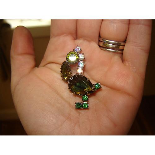THE NECK IS DONE IS 4 A/B STONES. THE HEAD OF THIS BIRD IS A LARGER LIGHT GREEN RHINESTONE(ROUND).