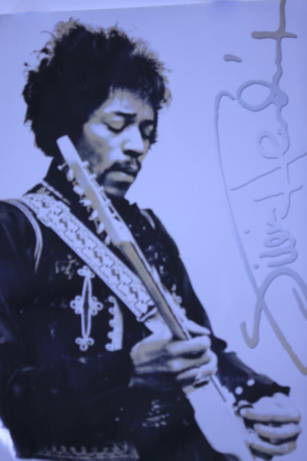 MUSIC POSTER **|**|** 24X36 INCHES; UNFRAMED; This poster shows Jimi Hendrix from the side as he plays his guitar. On the right is a copy of his signature. Jimi Hendrix was a guitarist, songwriter, and singer. Hailed by fans and critics, he is considered one of the most influential electric guitarists. His albums include Are You Experienced?, Axis: Bold as Love, Electric Ladyland, The Cry of Love, First Rays of the New Rising Sun, Band of Gypsys. Popular songs include Hey Joe, Purple Haze, Wind Cries Mary, Fire, Foxy Lady, Voodoo Child, All Along the Watchtower, Machine Gun, Bold as Love, Little Wing ; MSRP: $750