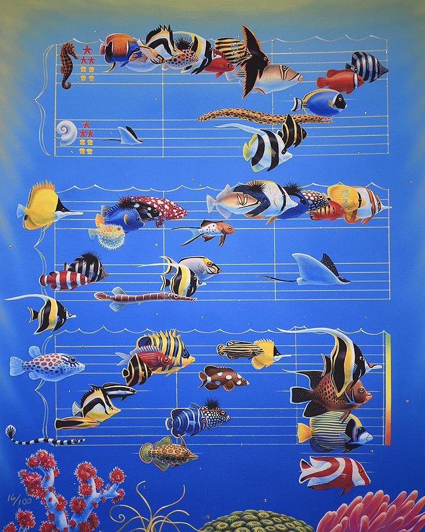 Giclee on canvas, limited edition hand embellished with acrylic, colored pencil and glitter by Charles Lynn Bragg. Fish arrange themselves in Beethoven's Für Elise piano composition. 15.5 x 20