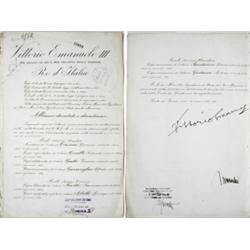 <b>1022. BENITO MUSSOLINI</b> (1883 - 1945) Italian dictator whose fascist supporters marched on Rome, securing him power; allied with Hitler, after many military and political setbacks he was captured and executed at war's end by partisans. Partly-printed D.S. "<i>Mussolini</i>" 2pp. folio, Rome, mar. 16, 1936, a military appointment or award in Italian, boldly signed by Mussolini at conclusion, and additionally signed by <b>VICTOR EMANUELE III</b> (1869-1947), King of Italy who essentially served as a figurehead during Mussolini's administration and abdicated the throne following the end of World War II. Spindle holes at left from disbinding, else very good.<b> $100-150</b>