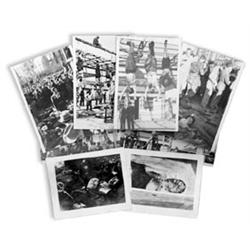 (1883 - 1945) Italian dictator whose fascist supporters marched on Rome, securing him power; allied with Hitler, after many military and political setbacks he was captured and executed at war's end by partisans. A fine and rare lot of Mussolini items, a grouping of eight chilling original photographs, two 3 1/2" x 5" snapshots and six 4 1/4" x 3 1/2" b/w photo postcards, all showing the gruesome execution and hanging of Mussolini, his mistress Clara Petacci, and four other fascist supporters. Includes images of the six victims strung up by their ankles, the bodies piled on the ground after they were shot, a bloodied Mussolini holding a mock Roman scepter in his hand while lying on top of Petacci, and a truly frightful close-up of a Mussolini's mutilated corpse lying in an open casket. Eight pieces, very good condition.
