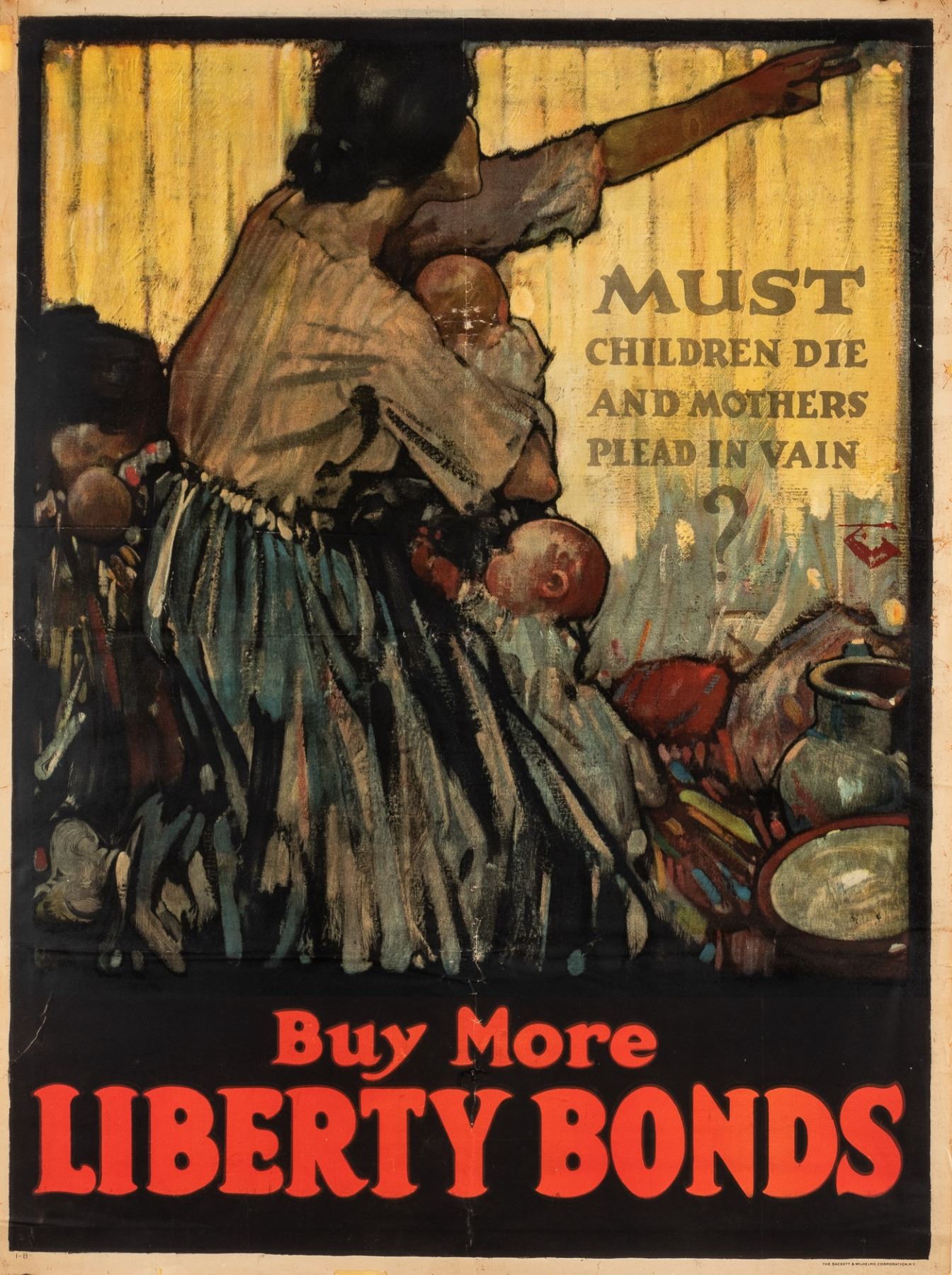WWI liberty bonds poster 'Must Children Die and Mothers Plead in Vain?', artwork by Henry P. Raleigh (1880-1944), The Sackett & Wihelms Corporation, New York, 40 x 30 inches. Minor chipping on edges, folds, and tears along center.