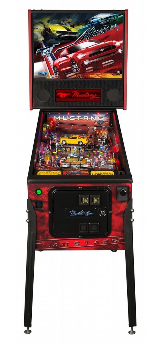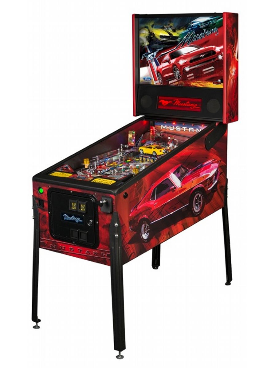 Among the many features of Mustang Pro are: --All LED control and general illumination lighting --4 pop bumpers --5 drop target bank with standup targets behind the drops --Twin stacked ramps with entries that elevate up and down diverting the ball flow --Captive ball target --Spinning target --Ball scoop --Numerous stand up targets --Scale collectible Mustang car --Player selectable licensed driving music in collaboration with Sony Music