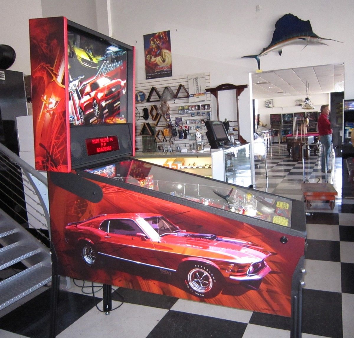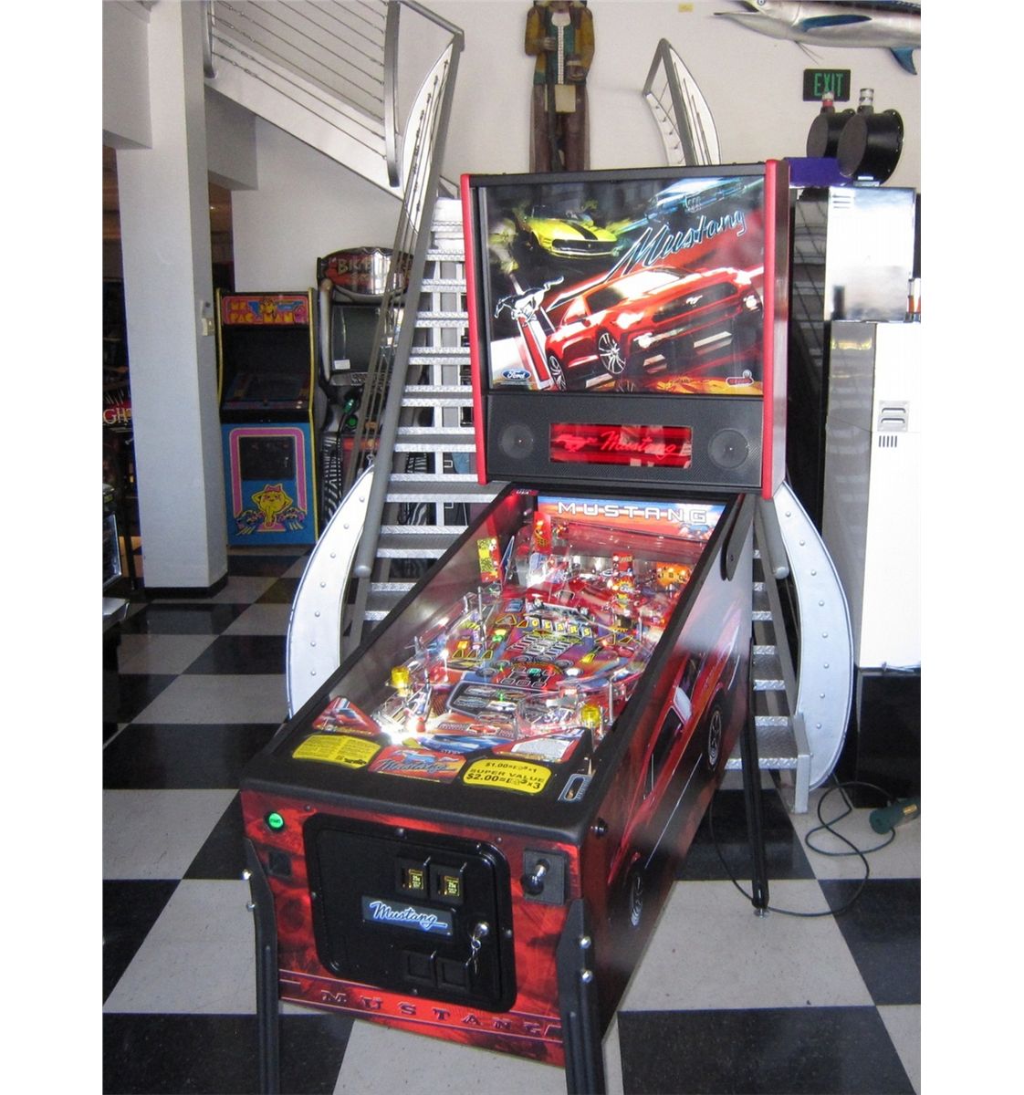 Among the many features of Mustang Pro are: --All LED control and general illumination lighting --4 pop bumpers --5 drop target bank with standup targets behind the drops --Twin stacked ramps with entries that elevate up and down diverting the ball flow --Captive ball target --Spinning target --Ball scoop --Numerous stand up targets --Scale collectible Mustang car --Player selectable licensed driving music in collaboration with Sony Music.