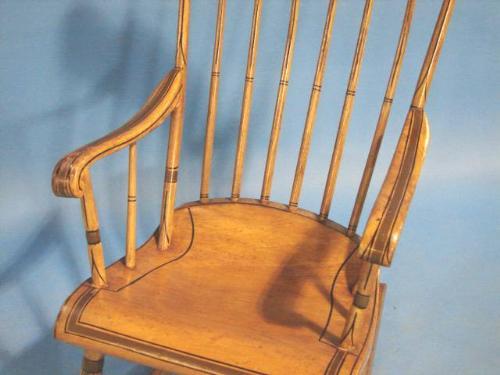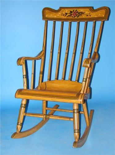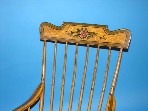 MUSTARD PAINTED WINDSOR ROCKER. Plank bottom. Retains original mustard paint with olive and black stenciling with painted floral decoration at top of back. 39" H to top of back, 17" H to top of seat, 19.75" W