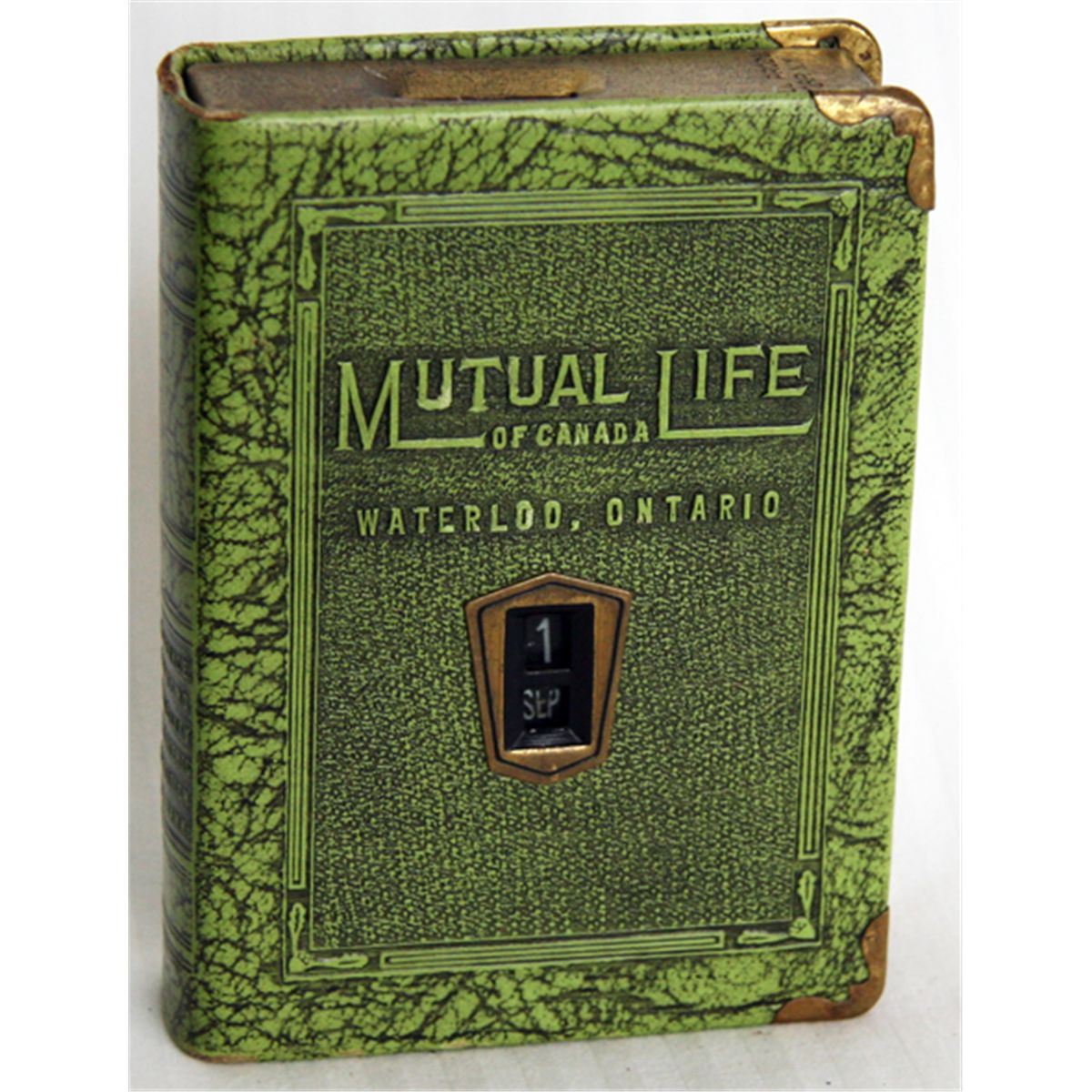 MUTUAL LIFE OF CANADA, WATERLOO, ONTARIO, with date window on front. Coin slot on top. Key lock, with key present. Date window on front. No serial number. 8cm x 11cm x 2 1/2cm. Light green cloth or leatherette cover. Maker-Zell Prods. Corp, NY. No patent information. VF.