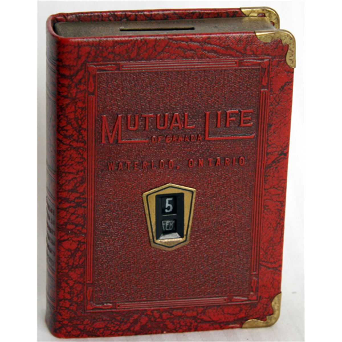 MUTUAL LIFE OF CANADA, WATERLOO, ONTARIO, with date window on front. Coin slot on top. Key lock, with key present. Date window on front. No serial number. 8cm x 11cm x 2 1/2cm. Dark red cloth or leatherette cover. Maker-Zell Prods. Corp, NY. No patent information. VF.