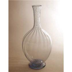 hellblaues Glas. Ovoider Korpus mit schlankem langem Hals, senkrecht optisch gerippte Wandung, applizierter Rundfuß. H.: 29,3 cm. Unter dem Stand bez.: MVM Cappelin (dreizeiliger Ätzstempel). 1920er Jahre