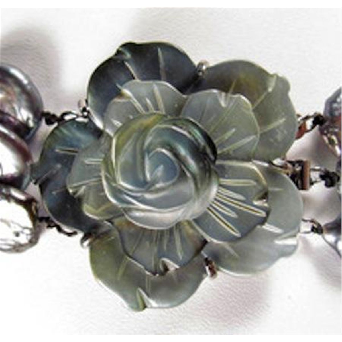 Three Row Black Coin Pearl Necklace Flower Shell Clasp