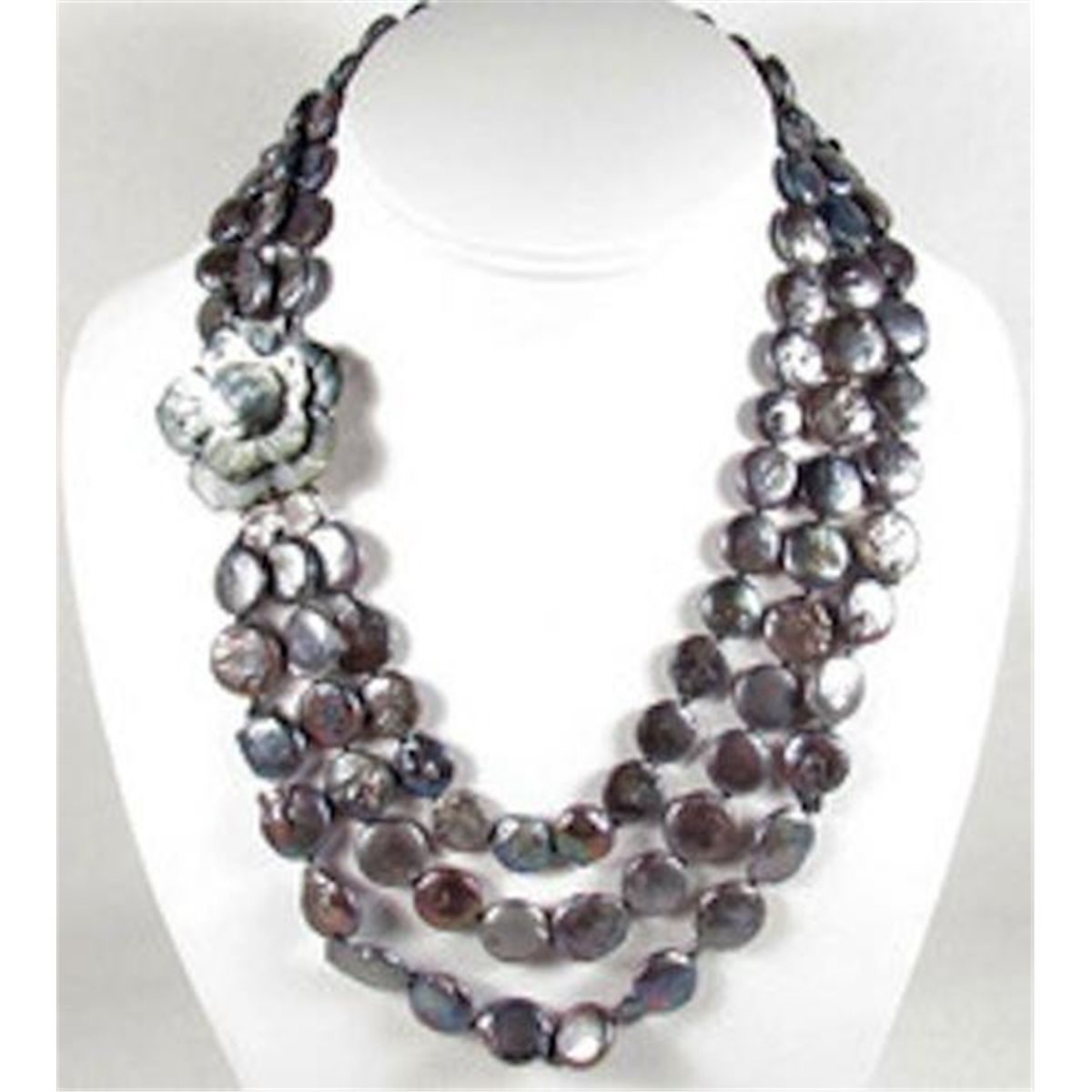 Three Row Black Coin Pearl Necklace Flower Shell Clasp