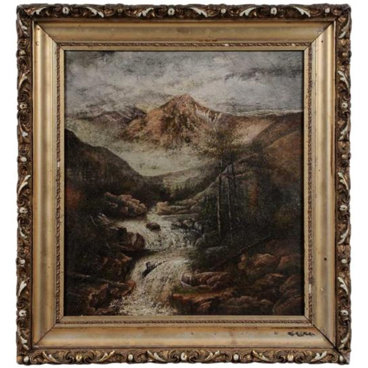 MWF1303 Western Landscape With Waterfall, signed indistinctly lower right ~F.E. Kin____~, oil on canvas, 20-1/8 x 18-1/4 in.; original gilt wood and composition frame