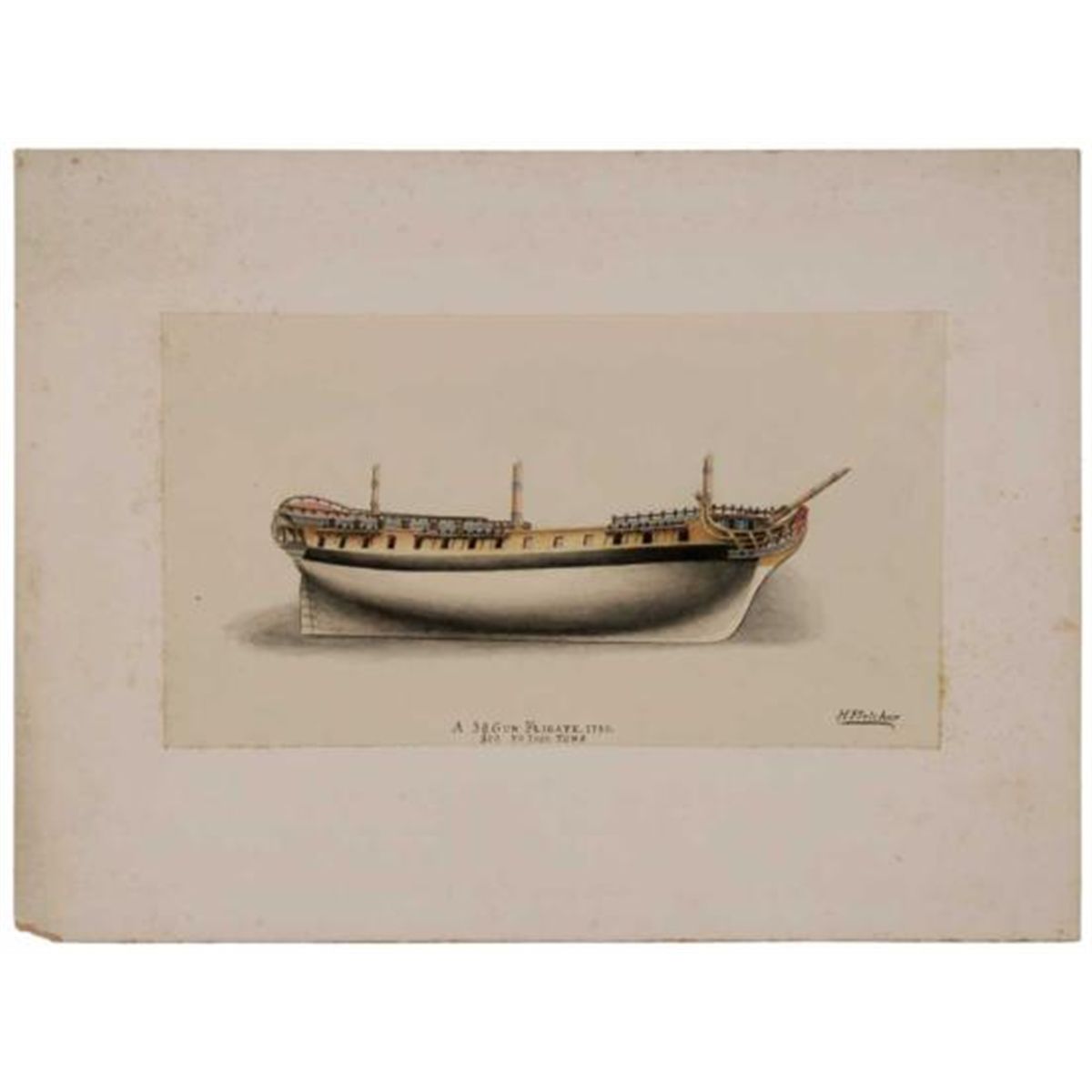 MWF1309D Watercolor on paper laid on card. A 38 Gun Frigate 1790, 6-1/2 x 11-5/8 in. signed lower right ~H. Fletcher~ unframed (British, 19th/20th century)