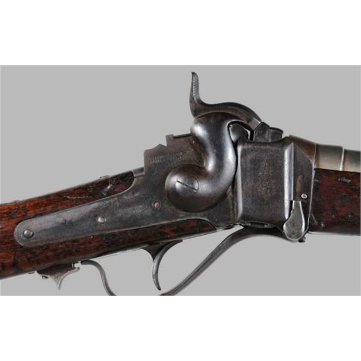 MWF1320 Springfield Sharp~s Model 1870 Rifle American, late 19th century, serial number on barrel 38291, .50-.70 cal., altered Type 1, 35-1/2 in. burnished white barrel with blackened rear sight, lockplate marked ~RS Lawrence Pat?1859~ and ~C. Sharp~s Pat?1852~, clear inspector~s cartouche on stock ~ESA~, ONLY 700 MADE