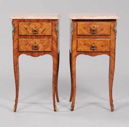 MWF1322 Pair Louis XV Style Marquetry Side Commodes French, 20th century, each with variegated pink marble top over two drawers, parquetry case sides, bronze mounts, 28-1/4 x 15-3/4 x 10-3/4 in.