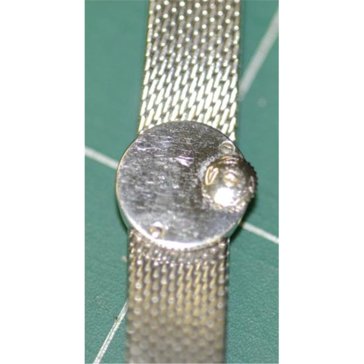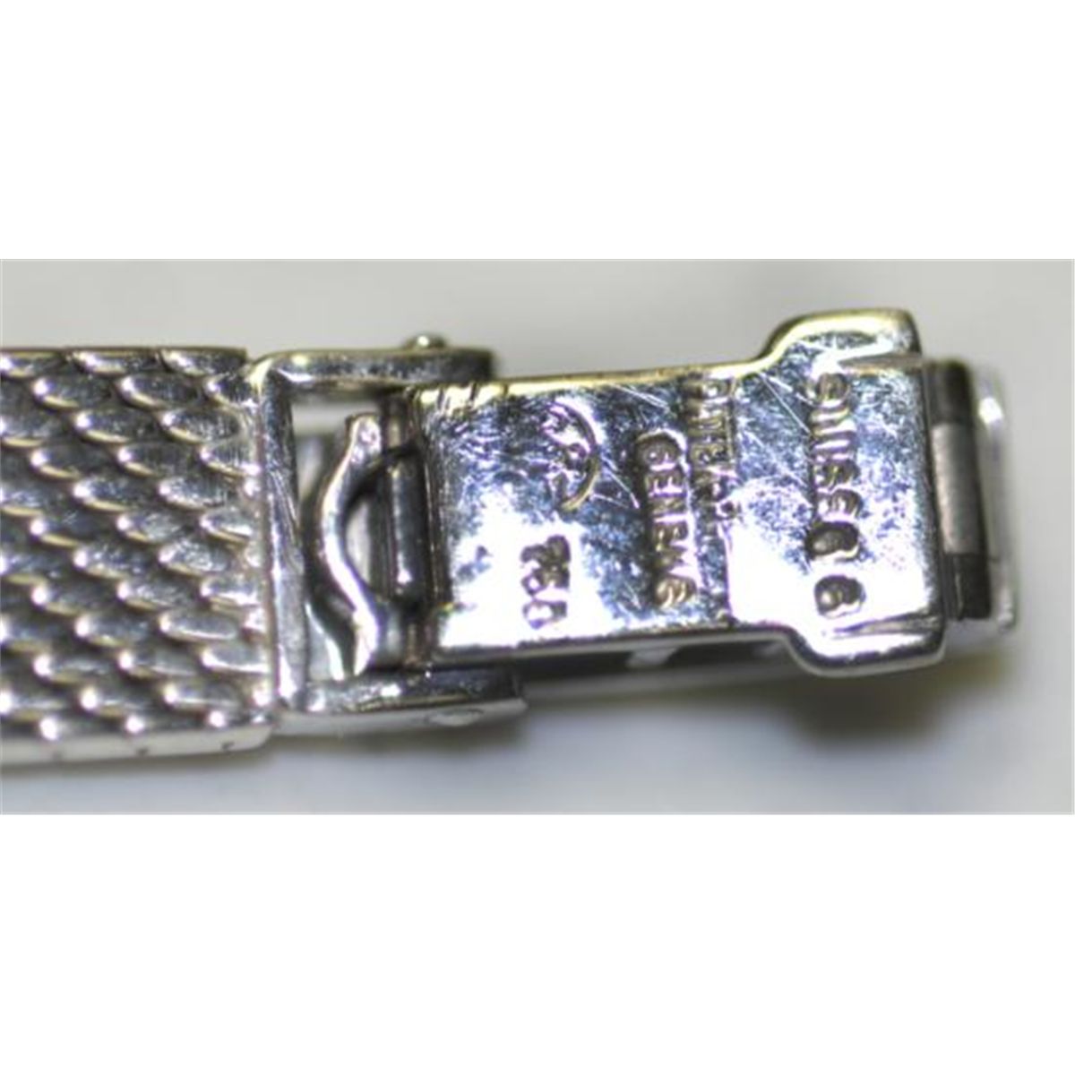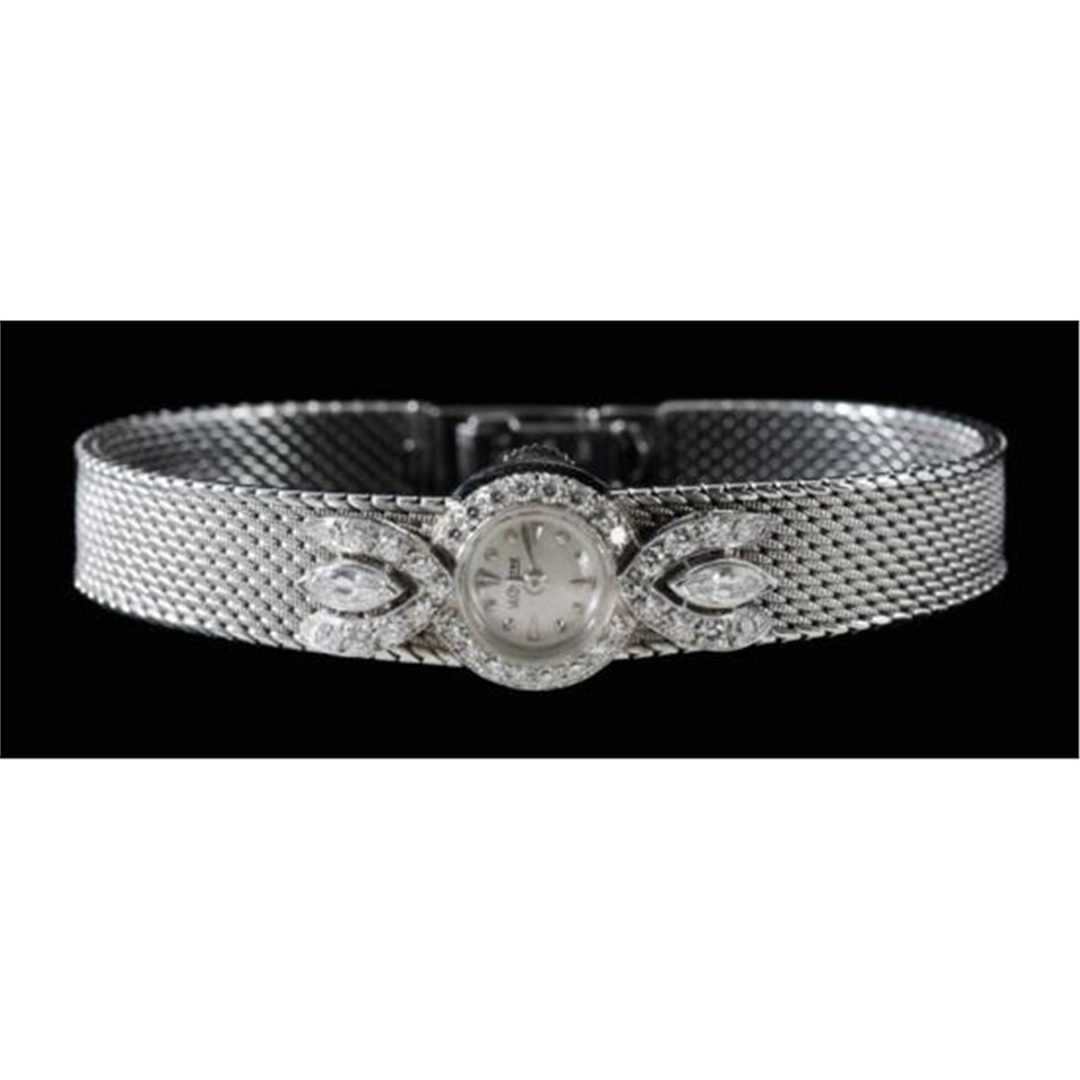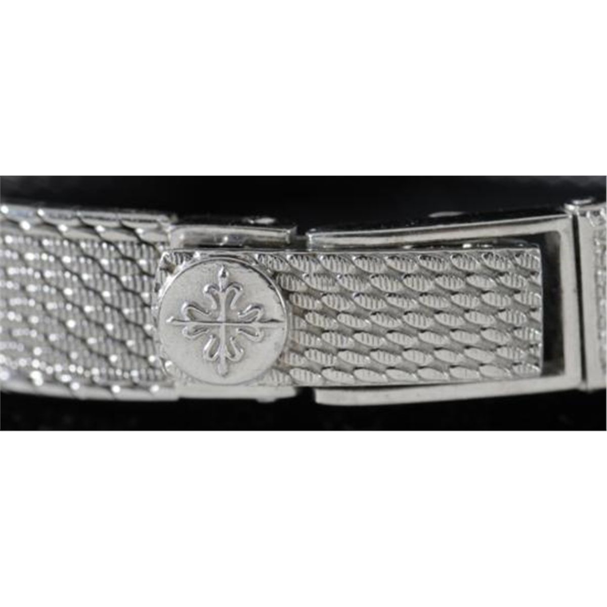 MWF1335 Platinum and Diamond Wrist Watch bezel and band accented with 2 marquise-cut diamonds, total estimated weight .40 cts. and 34 round and full-cut diamonds, total estimated weight .54 cts., color H, clarity VS, watch face and winding stem marked ~LeCoultre~, 18 kt. white gold mesh band with marks for Patek Philippe, 28 grams gross weight, 6 in. band