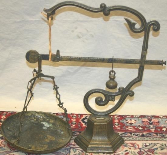 MWF1367 IRON & BRASS SCALE, C. 1900, H 19~:Measures H.19 1/2~ x 17~ x 6~.