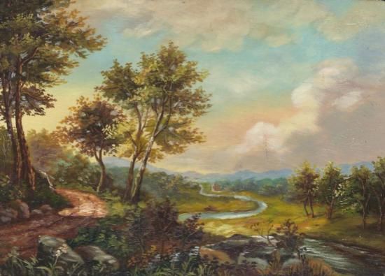 MWF1383H 5x7 Oil on Board Depiciting Stream Landscape Scene