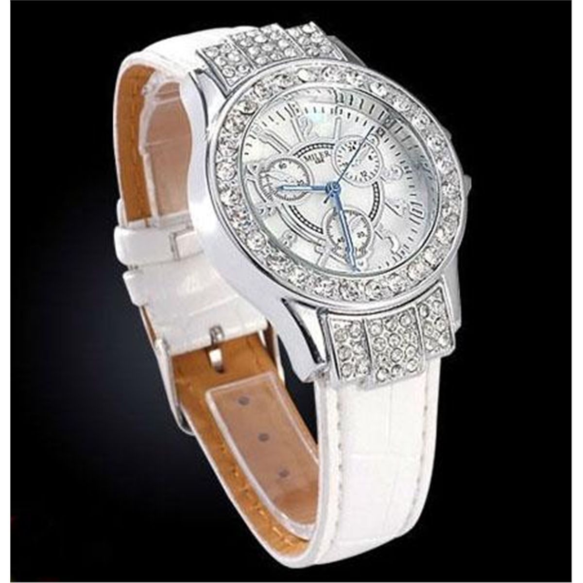MWF1410 Lovely Ladies Quartz wristwatch. Crystal Bezel Case white leather band, beautifully decorated.