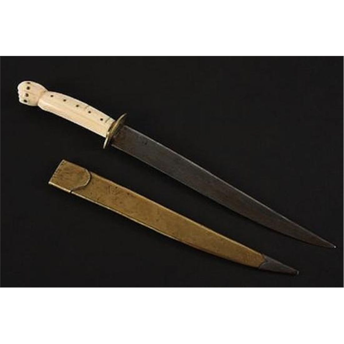 MWF1509 19th C Dagger with Carved Walrus Tusk Handle - ending in a fist, set with brass pins, the 10~ blade with brass hilt and original brass scabbard having steel tip, 15 1/4~ long overall