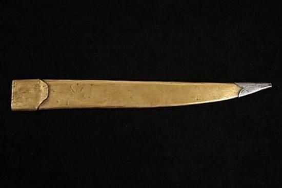 MWF1509 19th C Dagger with Carved Walrus Tusk Handle - ending in a fist, set with brass pins, the 10~ blade with brass hilt and original brass scabbard having steel tip, 15 1/4~ long overall