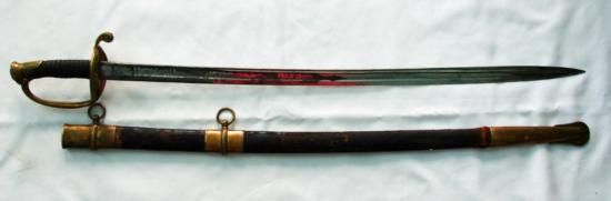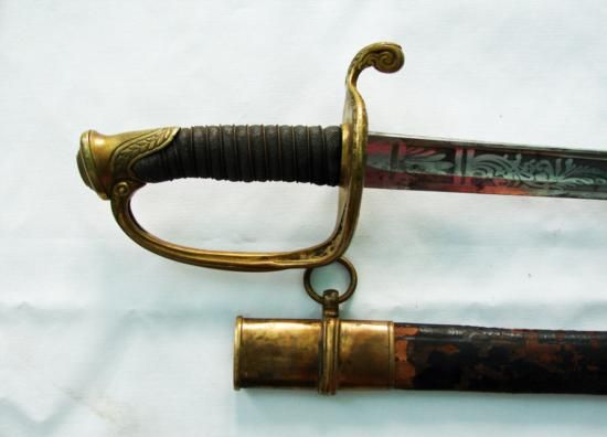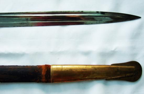 ORNATE European sword with acid etching on blade, sharkskin with wire wrap grip and a leather scabbard.