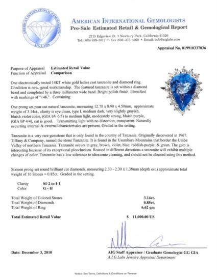 MWF271 Tanzanite & Diamond Ring (3.14 carat Tanzanite, .85 ct round diamonds, 14k White gold Setting 6.62 grams gold)