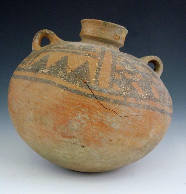 Peruvian Pre-Columbian Two Handled Jug, 450-1400 A.D., from Huaca de Sol, with original paint, cracked, H.- 8 1/8 in., Dia.- 9 1/2 in.