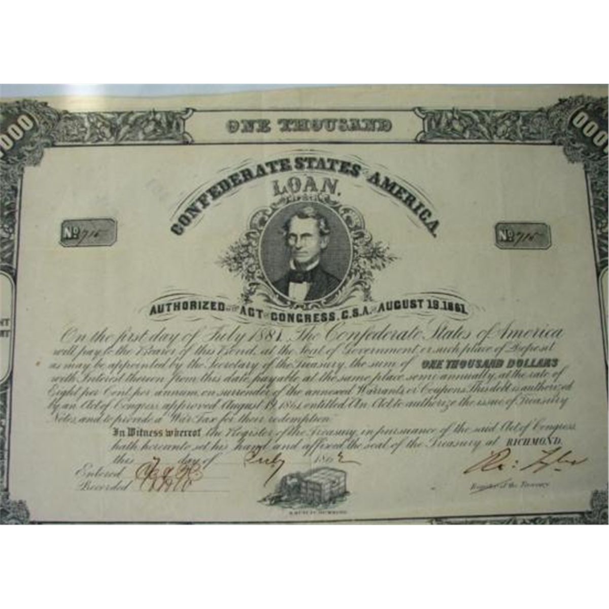 MWF912B Confederate $1000 war bond dated August 19th 1861 and numbered 715 with 33 attached coupons. Condition - Some yellowing, folds.