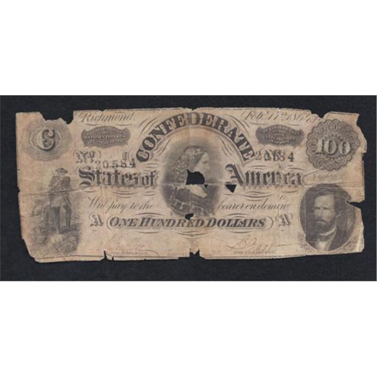 MWF912C 1864 Confederate $100 Note, Richmond, Number 20584. Good condition with holes, tears and wear to edges.