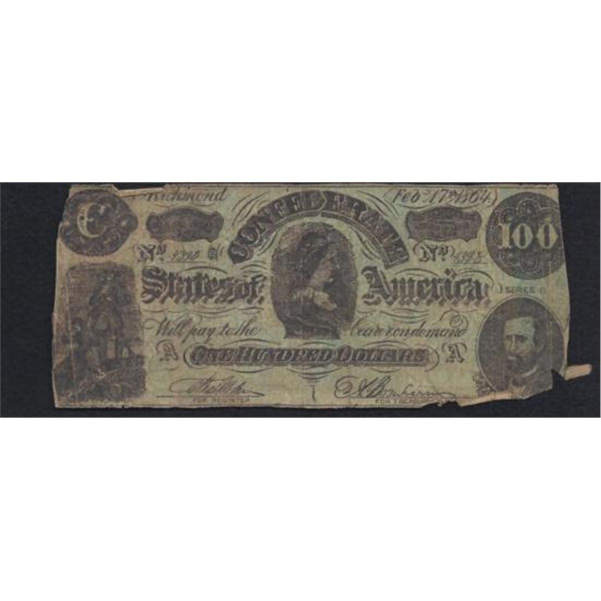 MWF912D Union produced ~counterfeit~ 1864 ~Confederate~ $100 Note, no reverse printing. Good condition, some holes, wear to edges.