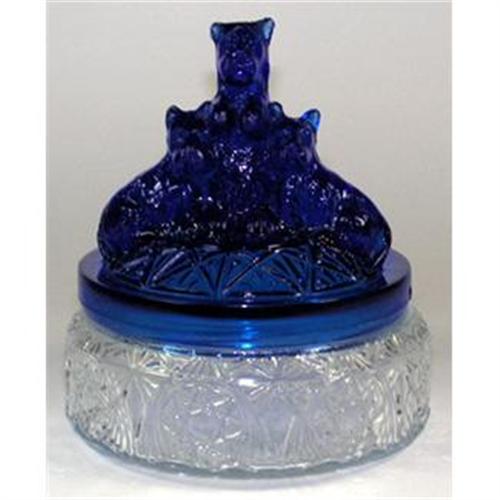 Known as MY PET, and rare with a cobalt blue lid and crystal base, powder jar is shown and described on pages 14-15 in Whitmyer: 'Bedroom & Bathroom Glassware of the Depression Years. Featuring a lid with three Scorrtish terriers - one central terrier flanked on both sides with pups and produced, circa 1930, in cobalt blue Depression glass. The crystal base is encircled with a series of intricately embossed eight sided stars. This Art Deco jar is beautifully made with fine definition of the terrier's features. Measuring 5 inches tall x 4 1/2 inches in diameter with both the lid, including all the ears, and the jar in excellent condition.
