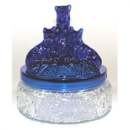 </font></strong>Known as MY PET, and rare with a cobalt blue lid and crystal base, powder jar is shown and described on pages 14-15 in Whitmyer: 'Bedroom & Bathroom Glassware of the Depression Years. Featuring a lid with three Scorrtish terriers - one central terrier flanked on both sides with pups and produced, circa 1930, in cobalt blue Depression glass. The crystal base is encircled with a series of intricately embossed eight sided stars. This Art Deco jar is beautifully made with fine definition of the terrier's features. Measuring 5 inches tall x 4 1/2 inches in diameter with both the lid and the jar in excellent condition. </font>