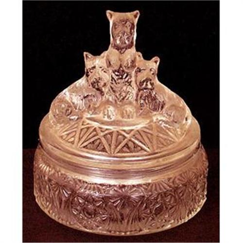 Known as MY PET, this pink Depression glass base, powder jar is shown and described on pages 14-15 in Whitmyer: 'Bedroom & Bathroom Glassware of the Depression Years. Featuring a lid with three Scottish terriers - one central terrier flanked on both sides with pups and produced, circa 1930. The base is encircled with a series of intricately embossed eight sided stars. This Art Deco jar is very well crafted with fine definition to the terrier's features. Measuring 5 inches tall x 4 1/2 inches in diameter. Both the lid and the jar are in excellent condition.